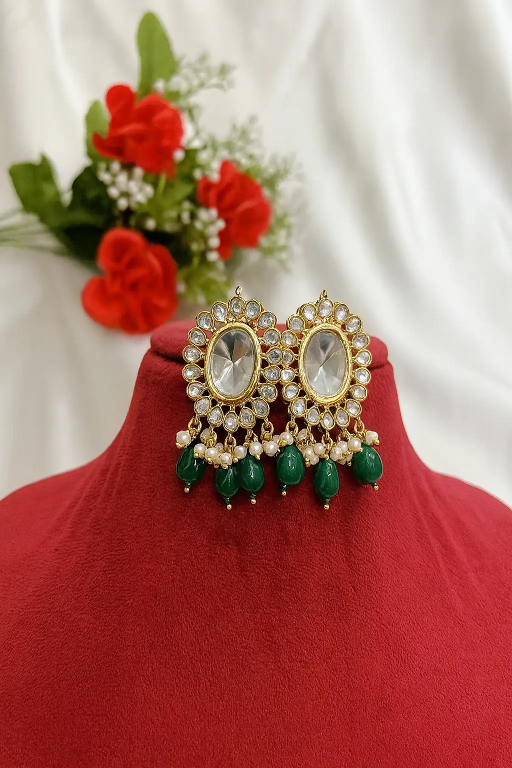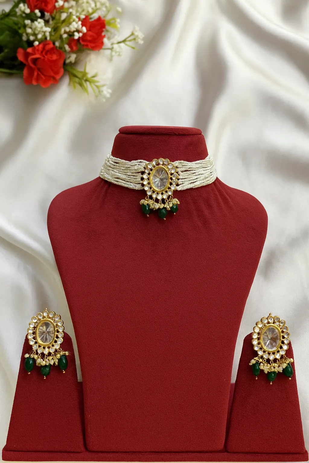 [This Kundan choker set is designed for women who prefer understated beauty. Its minimal design and subtle sparkle make it versatile enough for cocktail parties, engagement dinners, and semi-formal events. Lightweight and stylish, it adds just the right amount of glamour without feeling heavy.